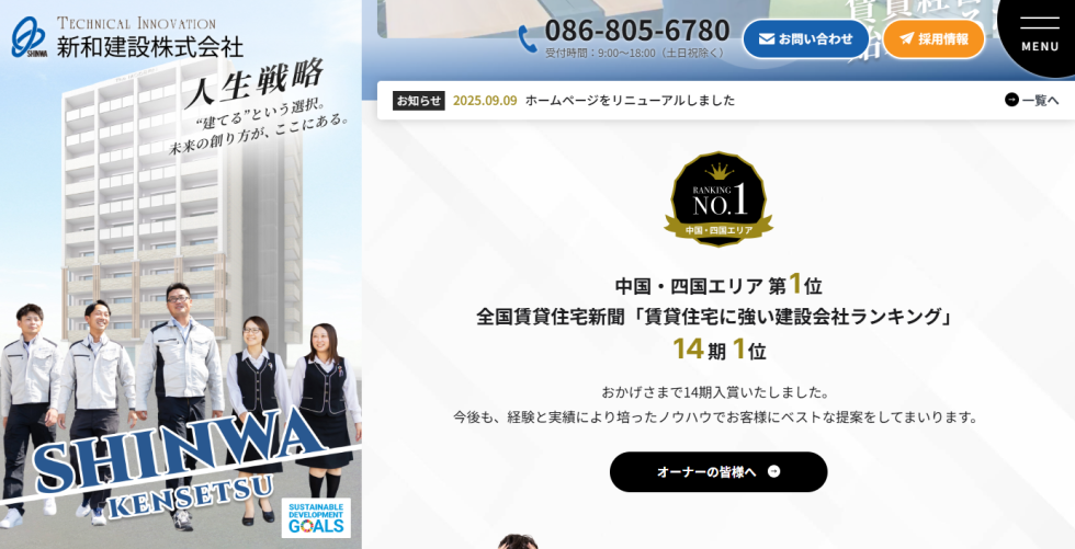 新和建設株式会社は、岡山県岡山市に本社を置く総合建設会社だ。設計・施工にトータルで対応する自社一貫体制を強みに、マンションやサービス付き高齢者住宅、事務所など、さまざまな建物を形にしている。特に、賃貸マンション・アパートの建設においては、県内有数の施工実績を誇っており、中国・四国エリアの賃貸住宅年間完工数は8期連続1位となっている(※週刊全国賃貸住宅新聞調べ)。