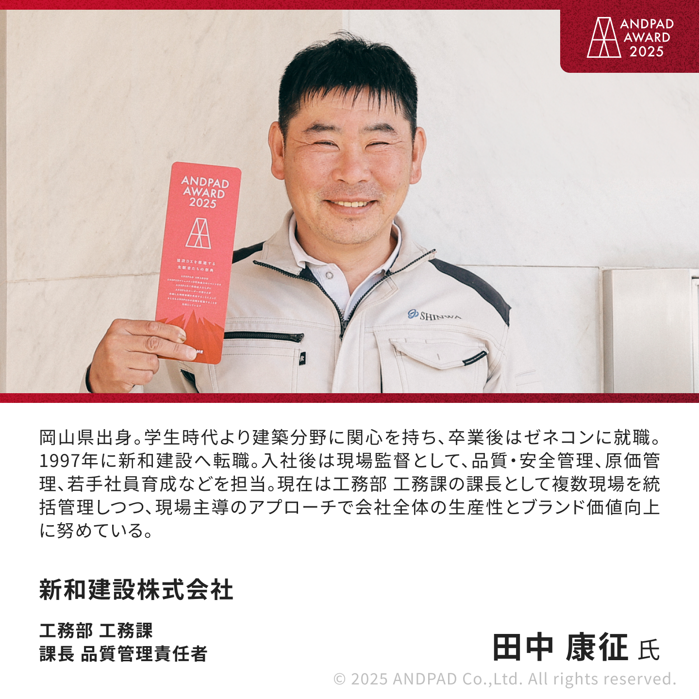ANDPADの利用状況をデジタルにスコアリングし、ANDPADを最も使っているユーザーを称賛するANDPAD AWARDのユーザー部門。今回は、2024年の1年間を通して、ANDPAD図面を総合的に最も活用したユーザーを表彰する「ベスト図面ユーザー賞」において第2位を受賞した、新和建設株式会社の田中 康征さんにお話を伺った。