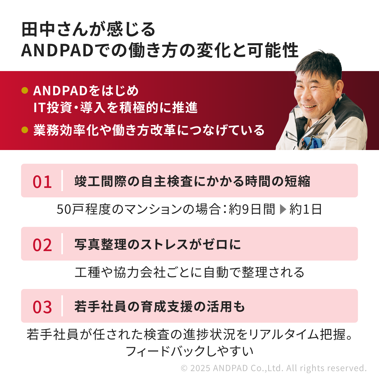 ただ、ANDPADで検査を実施するようになってからは、50戸程度のマンションであれば、約1日で検査を完了できるようになっています。自分が担当していないフロアの状況もリアルタイムで把握できますので、若手社員に任せている検査の確認もスムーズになり、時間短縮が図れています。やり直しや手戻り作業も減っていますし、情報共有が円滑になってコミュニケーションも取りやすくなっているので、業務上のストレスも軽減されています。ANDPADは、施工精度と生産性の向上にも寄与してくれています。