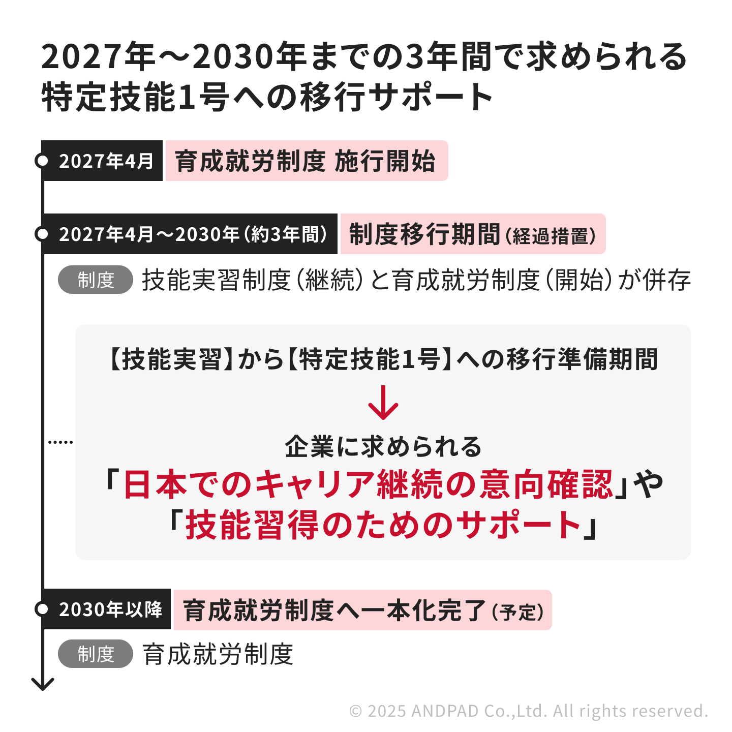 2027年4月の制度施行後、3年間の経過措置期間が設けられます。この期間は、技能実習制度と育成就労制度が併存することになり、企業側には適切な対応が求められます。