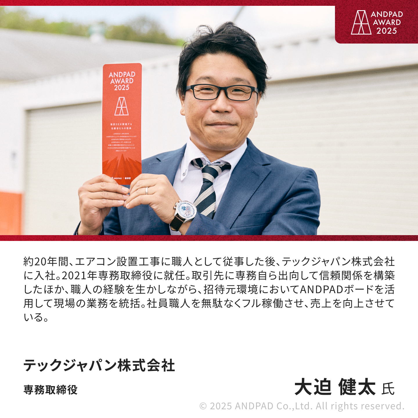 ANDPADの利用状況をデジタルにスコアリングし、ANDPADを最も使っているユーザーを称賛するANDPAD AWARDのユーザー部門。本記事では、「ベストボードユーザー賞」1位を受賞した、テックジャパン株式会社 専務取締役 大迫 健太さんにお話を伺った。