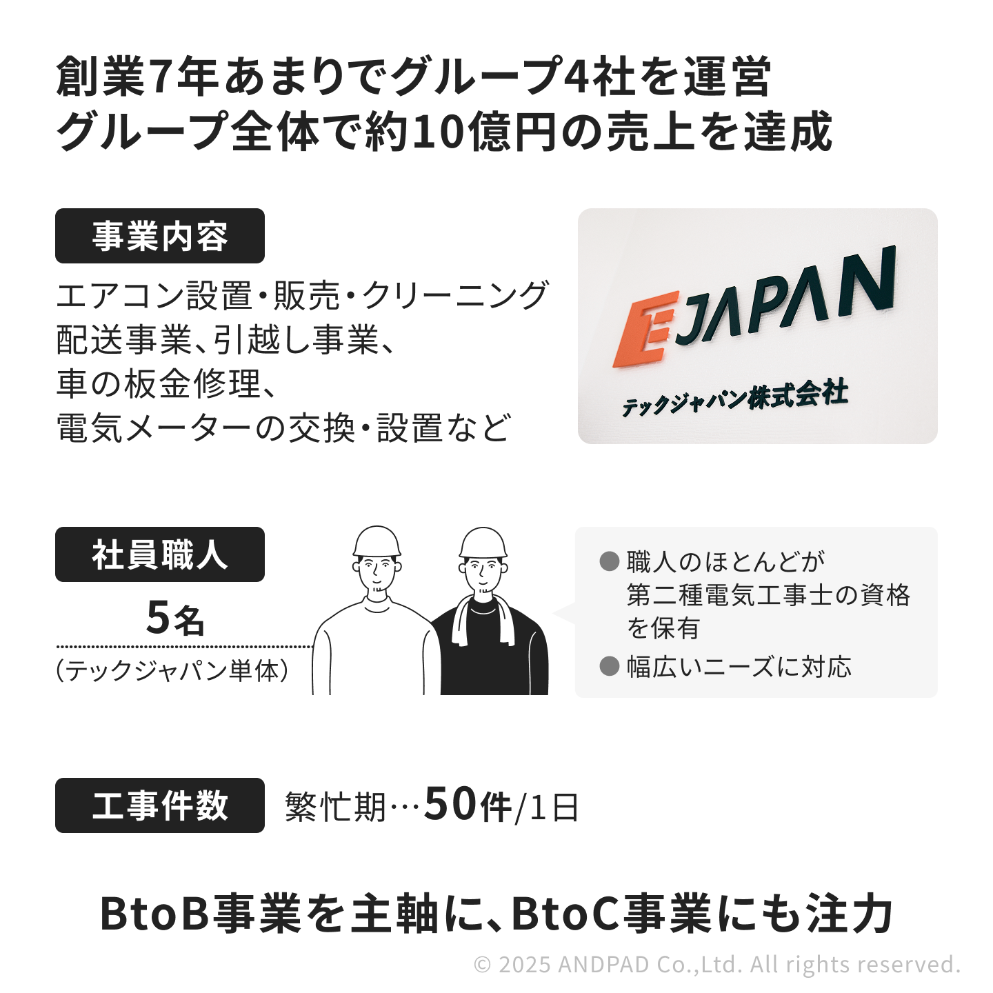 大迫さん: そうですね。おかげさまで、2023年にはエアコン設置工事で4億円弱の売上がありました。グループ会社全体では約10億円になりますね。テックジャパンとテックジャパンロジ以外にも、車の板金修理や電気メーターの交換・設置などを行うグループ会社を設立しており、現在、グループ会社は全部で4社となっています。