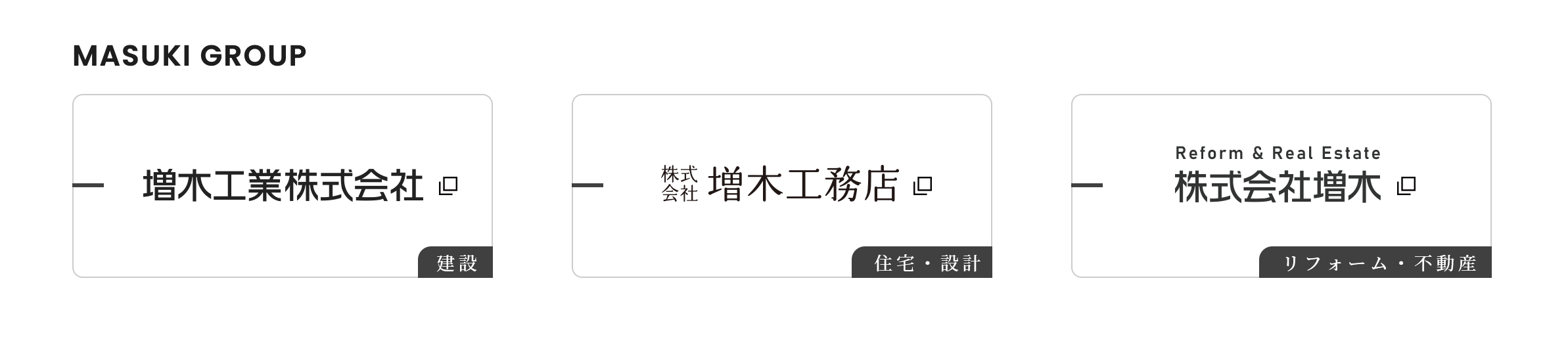 増木ホールディングスには現在、建設を担う「増木工業株式会社」、木造建築・設計を担う「株式会社増木工務店」、リフォーム・不動産を担う「株式会社増木」の3社がグループ企業として参画している。