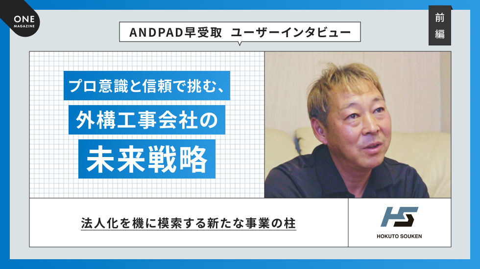 「ANDPAD早受取」は、ANDPAD受発注を利用して発行された請求書をもとに、請求金額を早期に受け取れるオンライン完結型のサービスだ。このサービスをテストユーザーとしていち早く活用し始めた、北海道札幌市の株式会社北都総建 代表の松坂也一さんにお話を聞いた。前編では北都総建の事業内容や松坂さんのこれまでの歩み、そして今後の事業展開予定について紹介する。