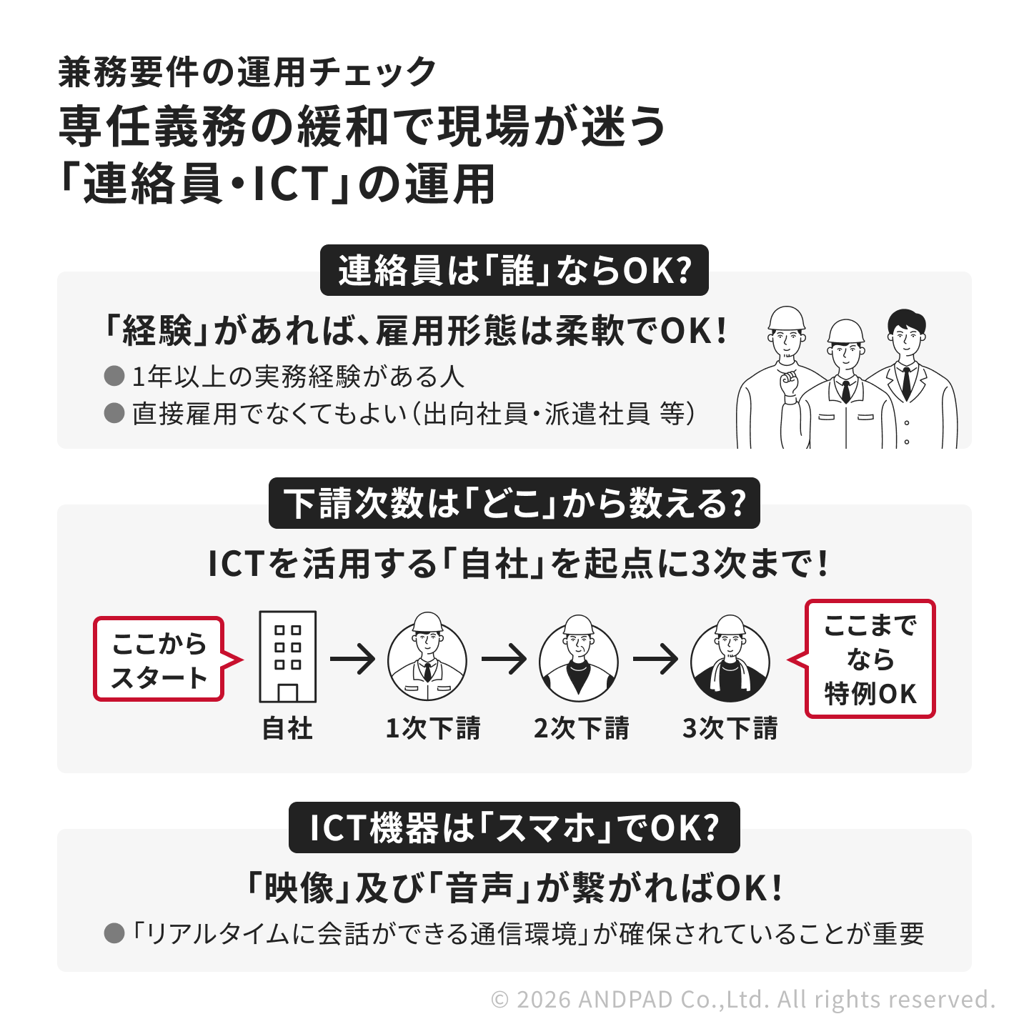 ・下請次数3次までとし、監理技術者等との連絡をする連絡員を配置した場合には、2現場まで兼任可能※特に問い合わせが多い「連絡員」「下請次数」「ICT機器」の具体的な運用ルールについて、このあと解説します。