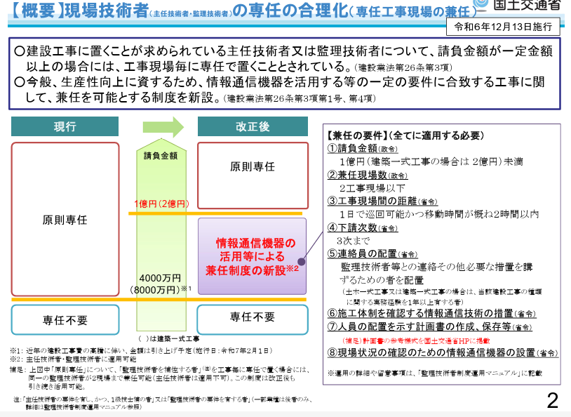 出典:国土交通省【建設業法】現場技術者の専任合理化https://www.mlit.go.jp/tochi_fudousan_kensetsugyo/const/content/001854111.pdf
