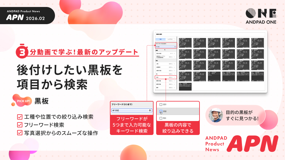 ANDPAD新機能を紹介する 「ANDPAD Product News (APN)」 。今回は 「ANDPAD 黒板」 より、「後付けしたい黒板の項目検索機能」についてご紹介します。